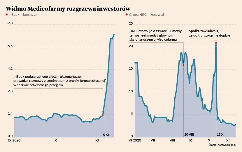 5 listopada notowany na NewConnect InBook poinformował, że jego pięciu głównych akcjonariuszy, posiadających blisko 60 proc. akcji, negocjuje z „osobą prawną działająca w branży farmaceutycznej". Chodzi właśnie o Medicofarmę. Chce ona przejąć kontrolę nad InBookiem, wnieść do niego aktywa i dzięki nowej emisji przekroczyć próg 90 proc. w akcjonariacie. Walne zgromadzenie InBooka w tej sprawie odbędzie się 2 grudnia.