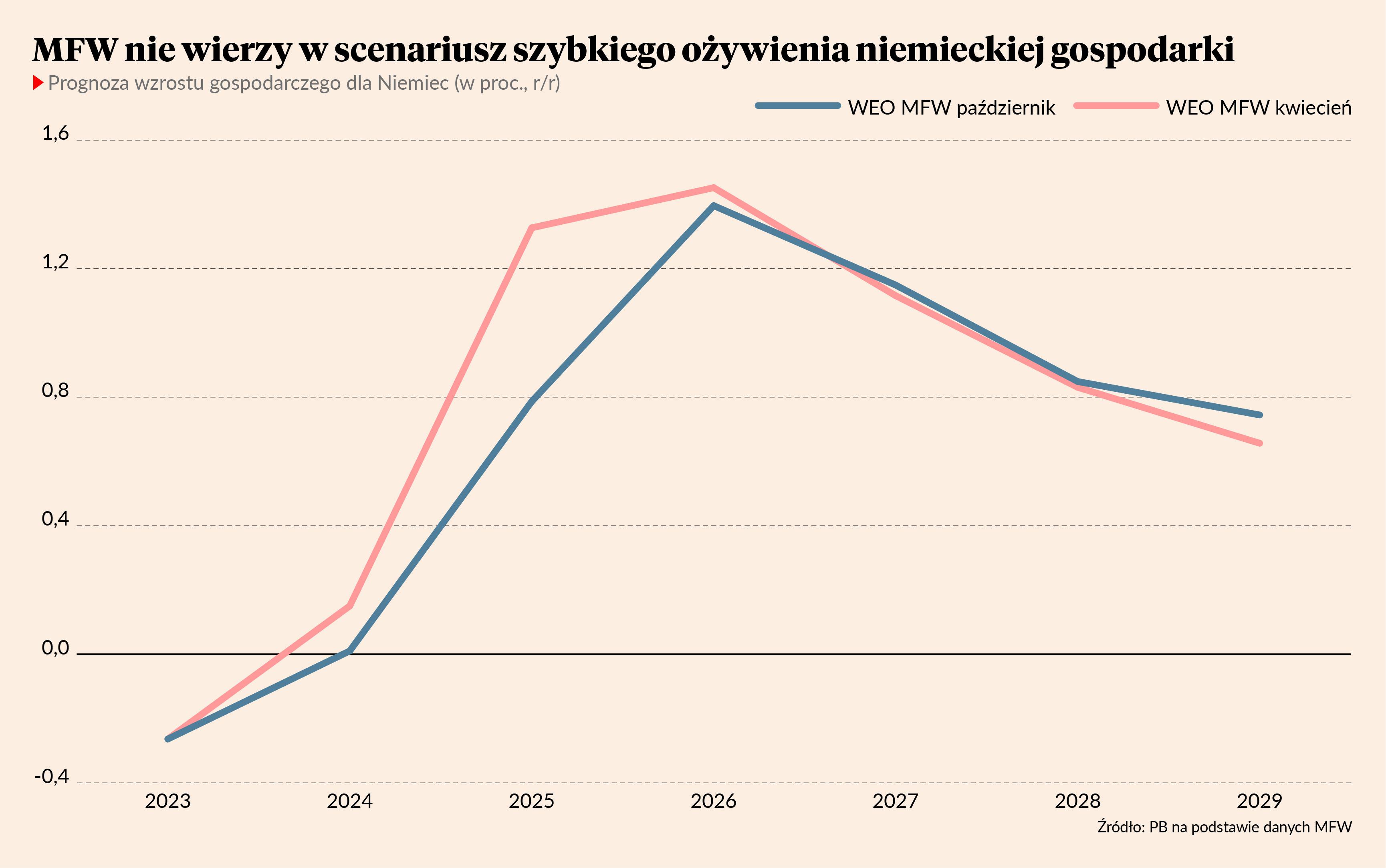 - MFW nie wierzy w scenariusz szybkiego ożywienia w niemieckiej gospodarce i znacznie obniżył prognozy wzrostu PKB dla tego kraju. O ile w kwietniowym wydaniu Word Economic Outlook (WEO) prognozy wskazywały, że realny PKB Niemiec rok do roku wzrośnie o 0,2 proc. w 2024 r. i 1,3 proc. w 2025 r., o tyle teraz jest to odpowiednio 0 proc. (czyli de facto stagnacja) i 0,8 proc. Ożywienie będzie mieć więc kształt litery L, a nie V. To zła wiadomość dla polskich eksporterów, którym mocno ciąży dekoniunktura u naszego zachodniego sąsiada.