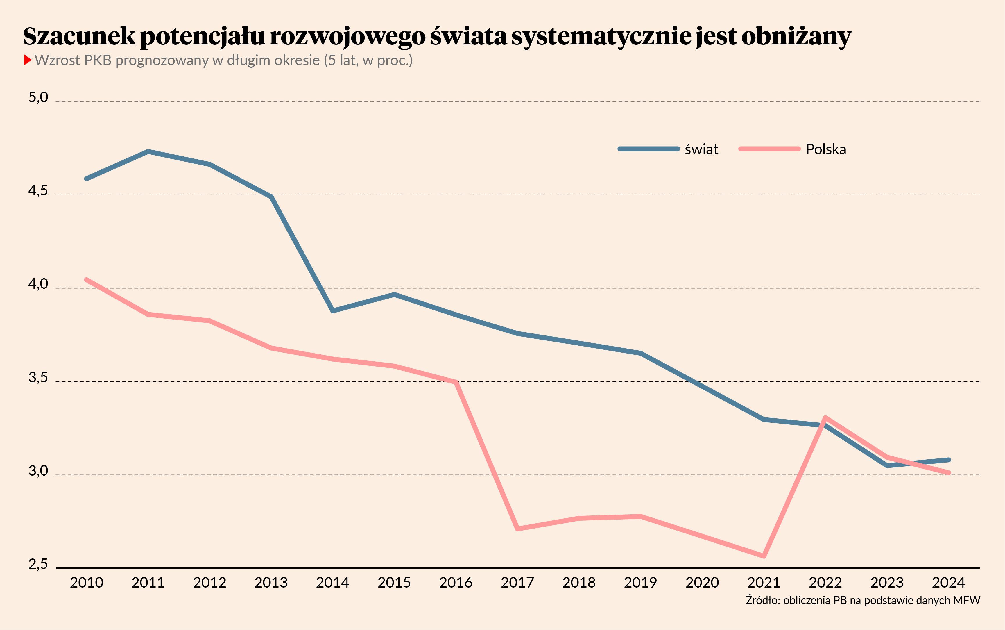 W najnowszym raporcie MFW dużo miejsca poświęca długookresowym perspektywom światowej gospodarki i malejącemu wzrostowi gospodarczemu. Jeszcze 10 lat temu długookresowy potencjał wzrostowy świata był szacowany na 4 proc., dziś już tylko na 3 proc. Ktoś powie, że to tylko 1 pkt proc., ale w praktyce oznacza to, że duża część krajów w ogóle nie będzie redukować luki rozwojowej dzielącej ich od najbardziej zaawansowanych gospodarek.