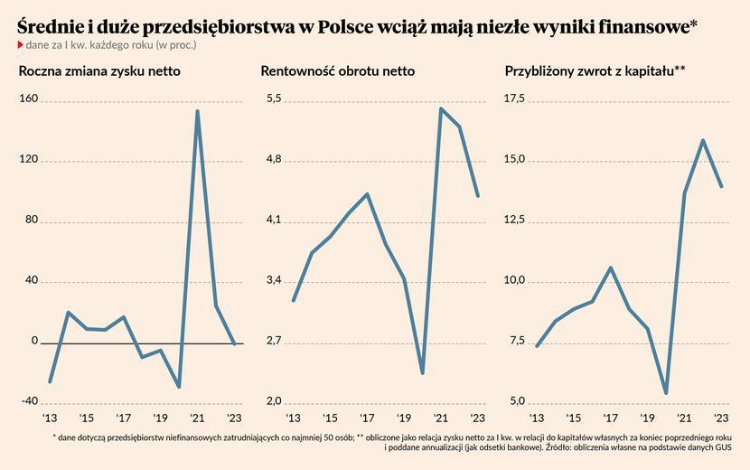 Odpowiedź na pytanie, czy spadek inflacji obniży rentowność firm, wymaga najpierw zdiagnozowania przyczyn wzrostu rentowności z minionych lat. Rentowność wzrosła dość wyraźnie i nie jest to efekt wywołany przez nieliczną grupę największych przedsiębiorstw. Odsetek firm z rentownością netto powyżej 5 proc. w Polsce wyniósł w 2022 roku 44 proc., podczas gdy średnio w latach 2015-2019 było takich firm 34 proc. Łączne nominalne zyski firm małych, średnich i dużych zwiększyły się między 2019 a 2022 rokiem ze 150 do 290 mld zł – niemal o 100 proc. W relacji to PKB był to wzrost z 8 do 12 proc.