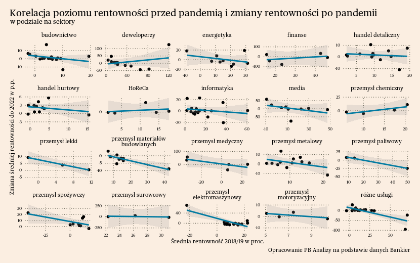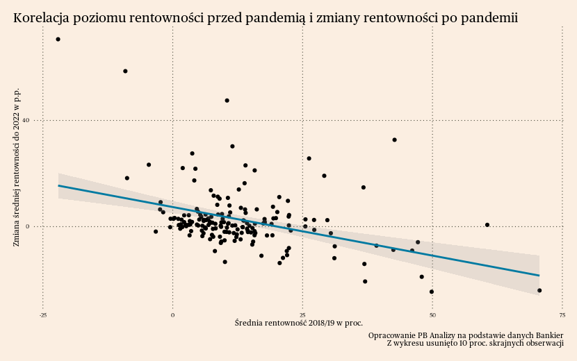 Nasza hipoteza jest następująca: upowszechniająca się indeksacja i mgła inflacyjna umożliwiły podwyżki cen mocniejsze od podwyżek kosztów, a szczególnie dotyczyło to branż i sektorów, w których ogólny poziom rentowności jest niski i do podwyżek łatwiej jest przekonać odbiorcę końcowego. Widzimy to w danych. Analizując wyniki finansowe kilkuset polskich spółek giełdowych widać ujemną korelacją między początkowym poziomem rentowności w latach 2018-2019, a wzrostem rentowności w latach 2020-2022. Najmniej rentowne firmy średnio najbardziej podniosły rentowność. Nie jest to jedyne możliwe wytłumaczenie tej zależności, ale tłumaczyłoby to dlaczego przy podwyższonej inflacji mogą rosnąć marże.