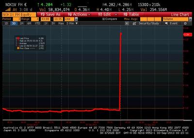 Kurs akcji Nokii po otwarciu notowań we wtorek rośnie o 40 proc. Kurs Microsoftu we Frankfurcie zyskuje ponad 2 proc.
