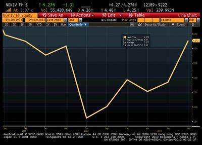 Ostatni raz kurs Nokii na podobnym poziomie był w marcu 2012 r.