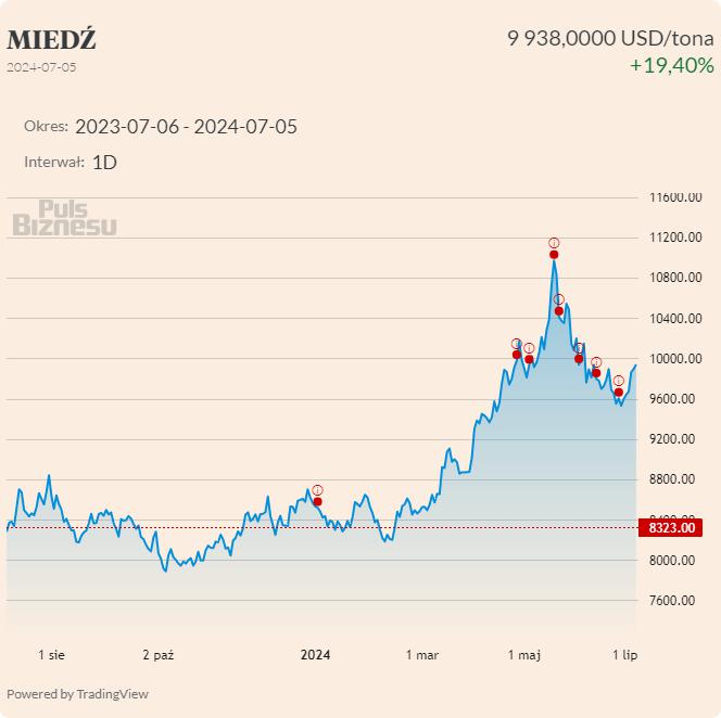 Handlujący miedzią mają nadzieję, że Rezerwa Federalna USA może zacząć obniżać stopy procentowe już we wrześniu, a nastroje dodatkowo poprawiły spekulacje odnośnie większej liczby środków stymulujących w Chinach, które są głównymi konsumentami miedzi. Metal w sprzyjających warunkach ma szansę zyskać ponad 5 proc. w tym tygodniu, co byłoby najlepszym wynikiem tygodniowym od połowy maja. Zaskakujące osłabienie w działalności usługowej i rozczarowujące dane dotyczące zatrudnienia w sektorze prywatnym w USA poparły argumenty za tym, aby Fed wkrótce zaczął łagodzić politykę. Rynki oczekują również kluczowego spotkania politycznego w Chinach pod koniec lipca, na którym najwyżsi urzędnicy mają ogłosić nowe środki wspierające gospodarkę. Ponadto dane Shanghai Futures Exchange pokazały, że zapasy miedzi w Chinach spadły trzeci tydzień z rzędu po odnotowaniu gwałtownych wzrostów od początku 2024 r.