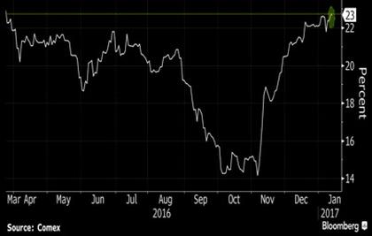 60-dniowa zmienność w notowanich kontraktów za miedź. Źródło: Bloomberg.