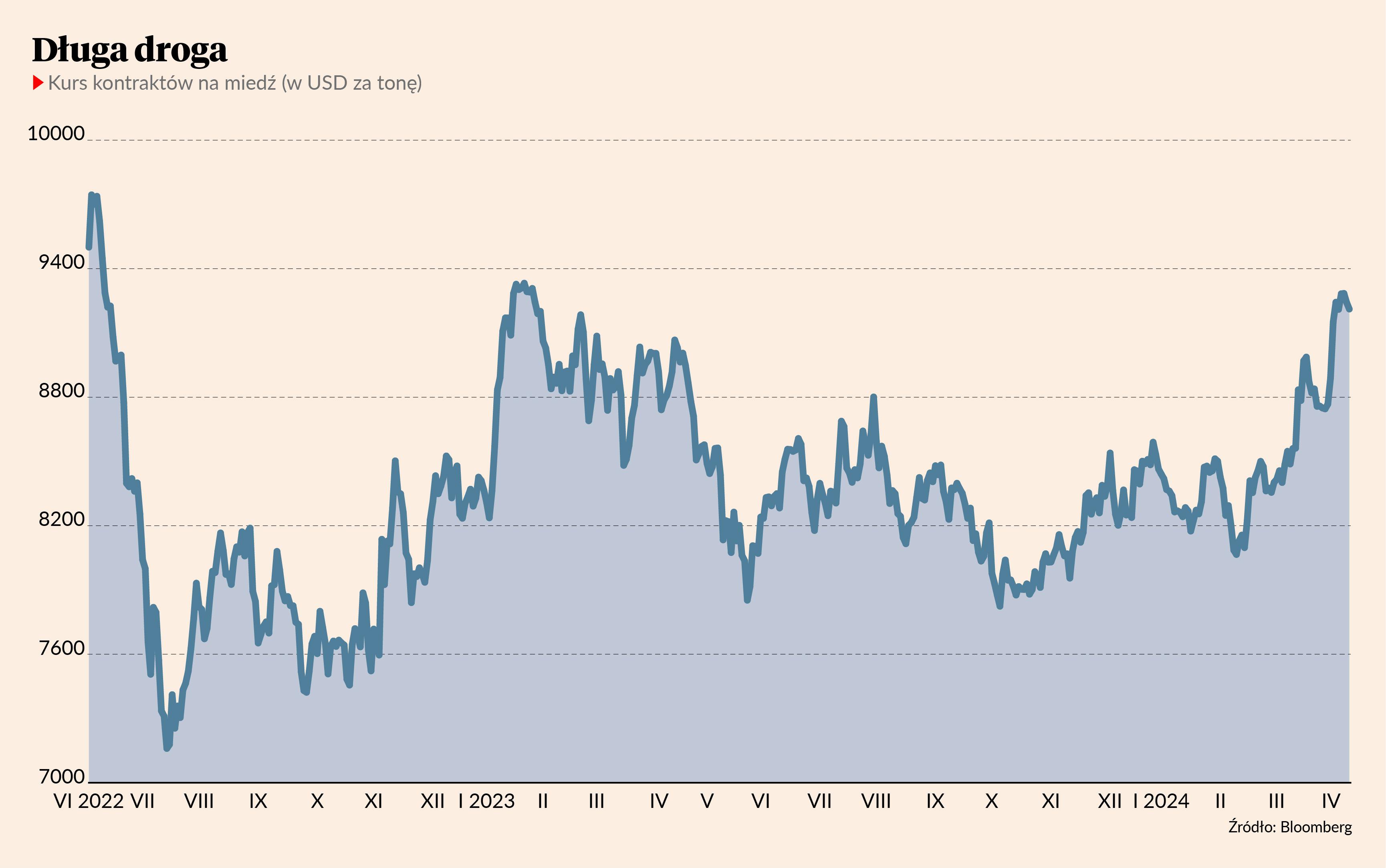 Za tonę miedzi na londyńskiej giełdzie metali trzeba zapłacić już ponad 9 tys. USD. Ostatni raz tak drogo było w czerwcu 2022 r., tuż przed bolesną bessą, która pomijając kilka krótkotrwałych zwyżek, trwała aż do IV kwartału 2023 r. Na przełomie października i listopada ubiegłego roku na rynku zaczął się klarować byczy scenariusz, pierwotnie związany z niedoborem podaży. Nie potrwało długo, zanim stratedzy banków inwestycyjnych zaczęli zwiastować rajd cenowy. Prognozy, jak widać na wykresie, okazały się trafione, choć nie obyło się bez kilku niespodziewanych czynników dodatkowo wspierających hossę.