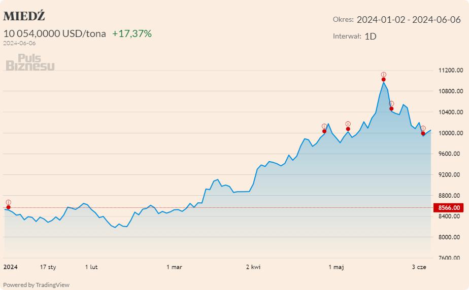 W maju kurs kontraktów na miedź, notowanych na Londyńskiej Giełdzie Metali (LME), podskoczył do rekordowych 11,1 tys. USD za tonę. Mimo że od tego czasu zaliczył ponad 10-procentowy spadek, to nadal jest w tym roku nad kreską 18 proc. Podobnie jest z akcjami KGHM - nawet mimo 17-procentowego spadku od szczytu są w tym roku na plusie 16 proc.