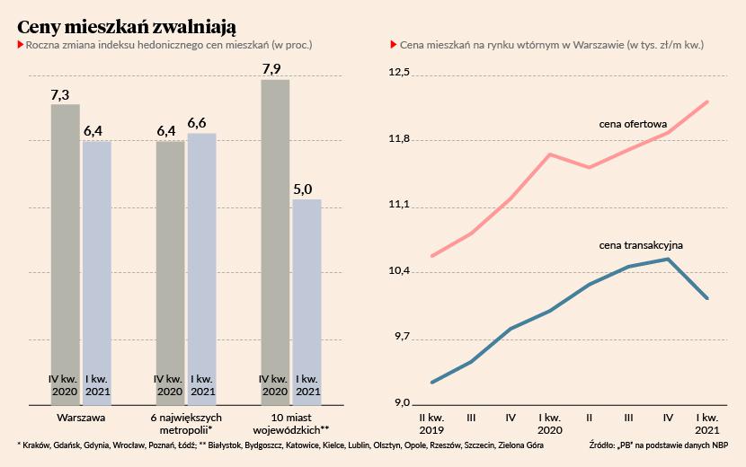 NBP podaje dane o cenach mieszkań raz na kwartał. Z najnowszej publikacji wynika, że w pierwszym kwartale 2021 r. średnia cena na rynku wtórnym w dziewięciu na szesnaście analizowanych dużych miast w Polsce rosła wolniej niż w czwartym kwartale 2020 r. W pięciu miastach ceny wręcz spadły. Mowa w tym momencie o cenach hedonicznych, czyli takich, które są skorygowane o jakość sprzedawanych mieszkań. To jest najlepsza miara trendów na rynku.