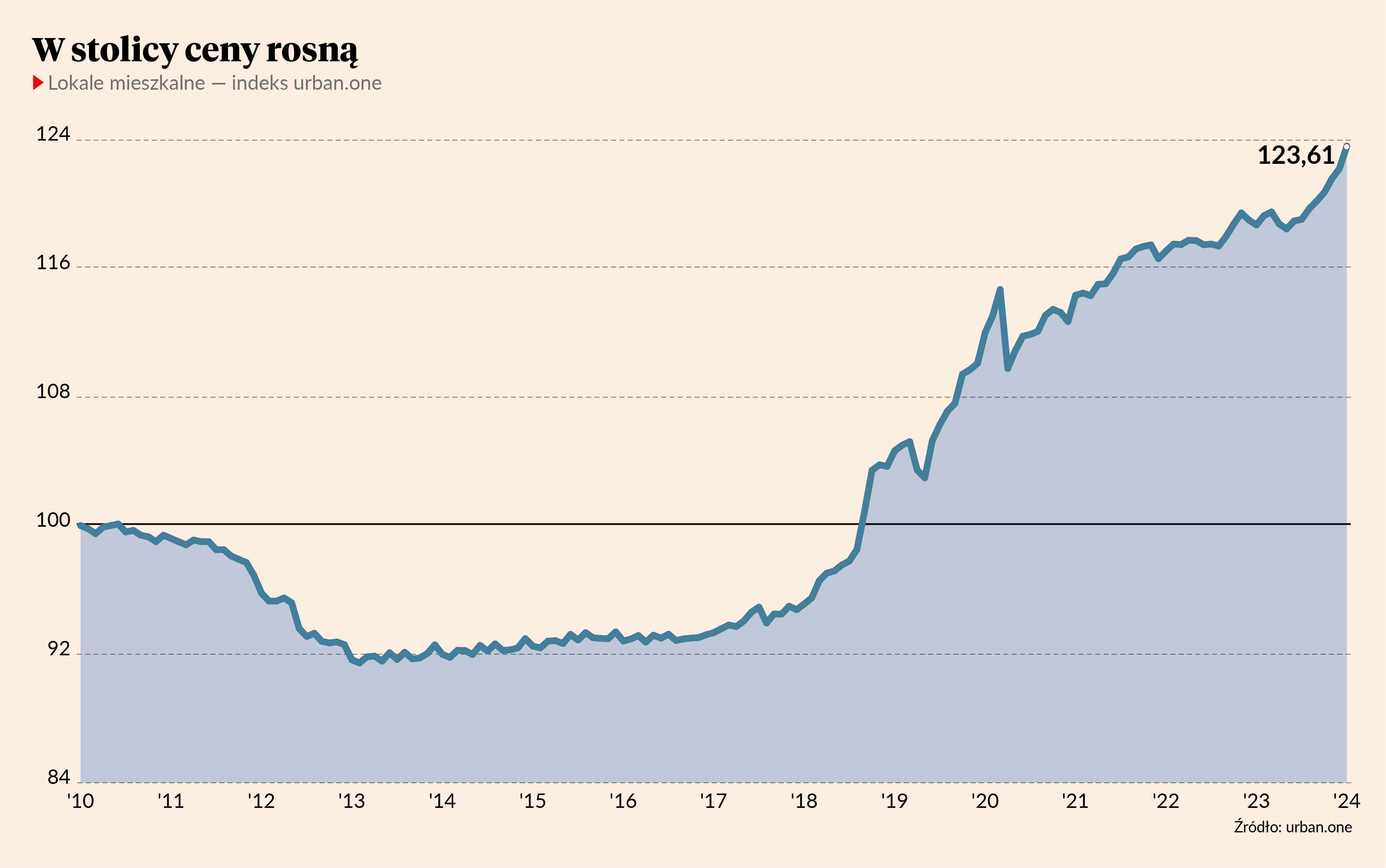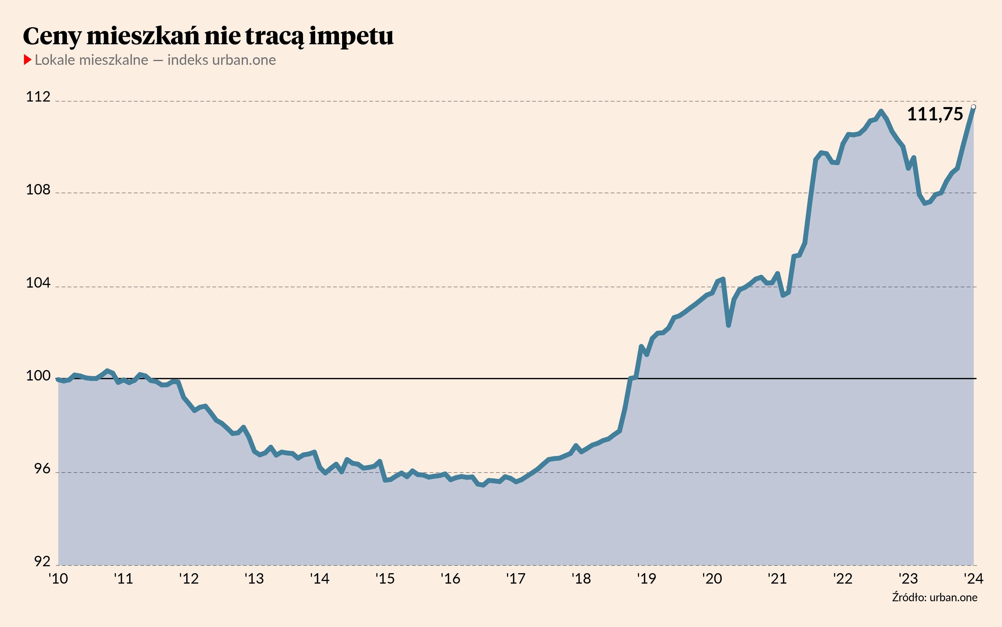 Ceny mieszkań w umowach notarialnych nadal rosły: w całej Polsce, w dużych miastach oraz w stolicy. Rosły też ceny gruntów pod zabudowę — wynika z raportu Cenatorium opracowanego dla „Pulsu Biznesu” i Bankier.pl. W styczniu wartość indeksu urban.one dotyczącego lokali mieszkalnych w Polsce wyniosła 111,75 pkt, co było wartością wyższą o 0,83 pkt od wartości z grudnia 2023 r.