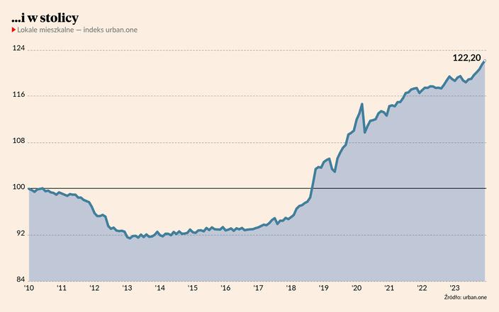 Wzrost wartości indeksu dla stolicy i innych dużych miast (poza nią) był niewiele mniejszy, a trend ten utrzymuje się od czerwca 2023 r. W Warszawie wartość indeksu urban.one sięgnęła w grudniu 122,20 pkt (wzrosła o 0,63 pkt w porównaniu z listopadem), a w dużych miastach wyniosła 124,44 pkt (wzrost o 0,71 pkt).