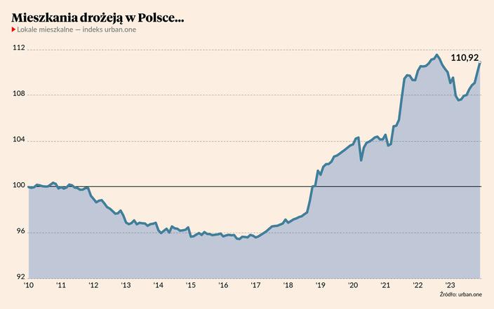 Dane z aktów notarialnych wskazują na niekończący się festiwal podwyżek cen mieszkań. Wartość opartego na cenach transakcyjnych indeksu urban.one dotyczącego mieszkań w Polsce urosła w grudniu 2023 r. w porównaniu z listopadem o 0,89 pkt i wyniosła 110,92 pkt — wynika z raportu Cenatorium opracowanego dla „Pulsu Biznesu” i Bankier.pl.