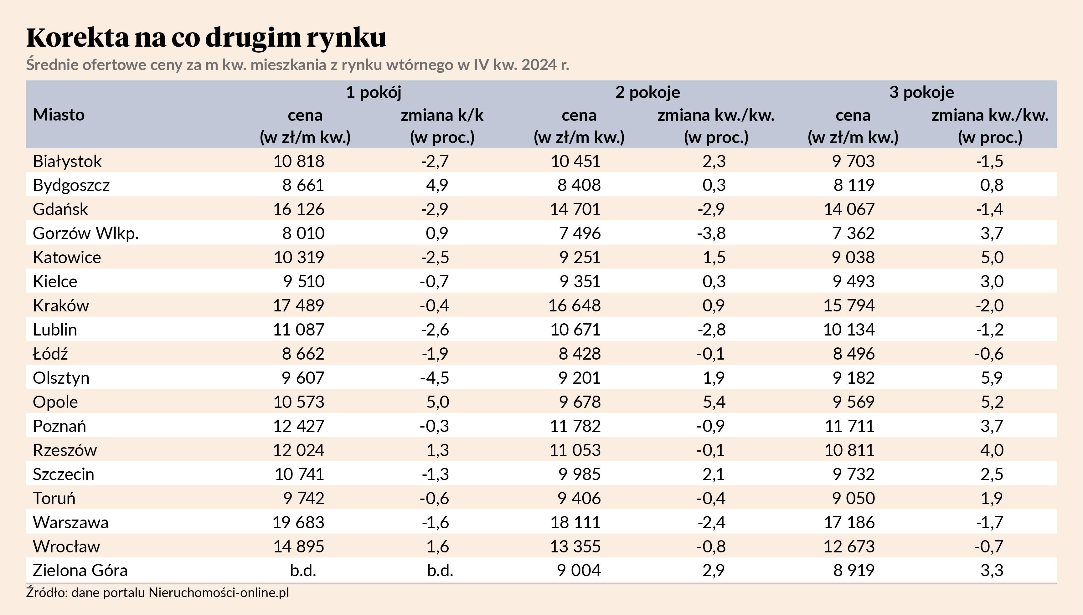 W ostatnim kwartale 2024 r. w 10 na 18 miast wojewódzkich zanotowano spadek średniej ceny mieszkań na rynku wtórnym — wynika z danych portalu Nieruchomości-online.pl. Lokale jednopokojowe na ośmiu rynkach staniały o ponad 1 proc., a na sześciu ceny się ustabilizowały. W Warszawie, Lublinie, Łodzi i Gdańsku korekta objęła wszystkie typy mieszkań: jedno-, dwu- i trzypokojowe.
