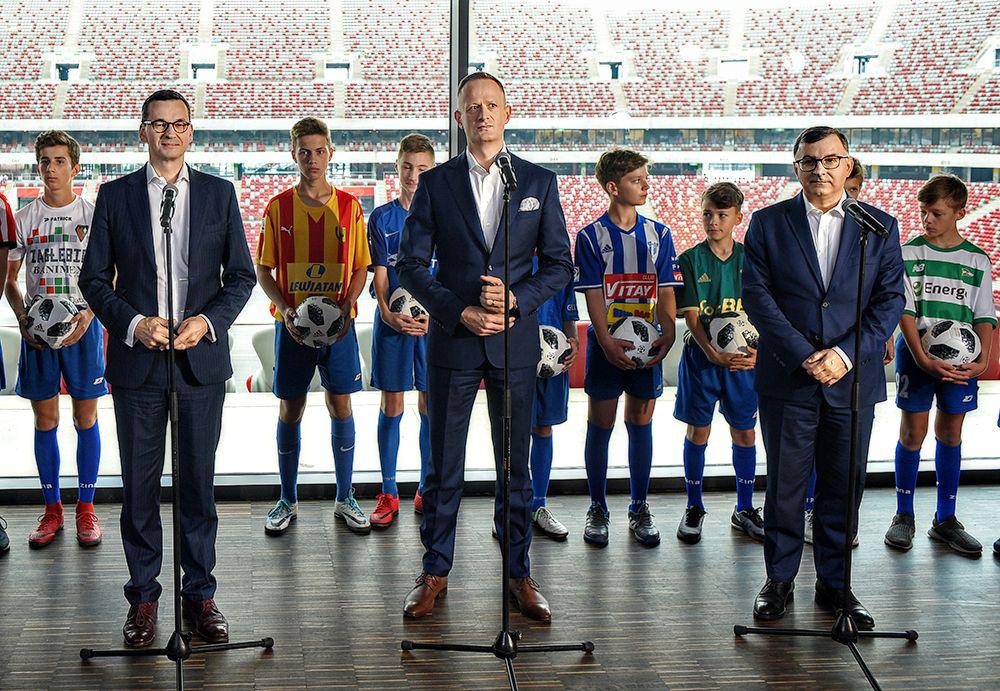 Przed polską piłką pojawiła się jednak szansa na lepszą przyszłość. Pomogą w tym pieniądze potężnych sponsorów. I to bardzo duże. Według nieoficjalnych informacji „PB”, nad wieloletnim projektem odbudowy polskiej piłki mocno pracuje kilkuosobowy zespół wspierany przez premiera Mateusza Morawieckiego. Choć sport nie jest domeną prezesa partii, to wymagane dla wszystkich dużych projektów błogosławieństwo od Jarosława Kaczyńskiego, jest. Finansowym motorem ma być Totalizator Sportowy (TS). Jest gotów wyłożyć aż 1,5 mld zł w ciągu 10 lat, z czego pierwsze 300 mln bardzo szybko — w ciągu dwóch. Za te pieniądze ma sfinansować rozwój infrastruktury i systemu szkolenia, by za kilka lat polski futbol zbierał żniwa z nowego pokolenia wytrenowanych piłkarzy. Choć piłka nożna nigdy nie była sportem nr 1 premiera (w młodości trenował tenis stołowy), to od dawna widać, że leży mu na sercu. Już w maju z jego inicjatywy zwołany został okrągły stół o piłce nożnej. W sierpniu uczestniczył natomiast w konferencji, na której ogłaszano wejście państwowego PKO BP w sponsoring Ekstraklasy.