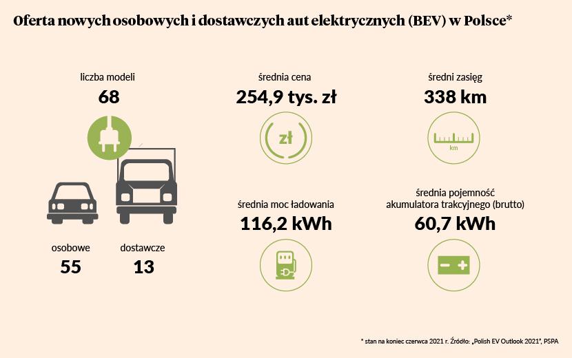 Z analizy przeprowadzonej na potrzeby „Polish EV Outlook 2021” wynika, że polscy klienci mogą wybierać spośród 68 modeli samochodów całkowicie elektrycznych (55 osobowych i 12 dostawczych). Te liczby stają się wyższe przy uwzględnieniu wszystkich wariantów mocy napędu i pojemności akumulatora. Pojazdy z napędem elektrycznym są już dostępne w każdym segmencie rynku: od pojazdów miejskich i kompaktowych po samochody sportowe i dostawcze. Najpopularniejszymi markami BEV pod względem liczby rejestracji są Nissan, BMW i Tesla (bez zmian względem poprzedniej edycji „Polish EV Outlook 2021”).