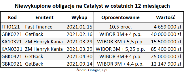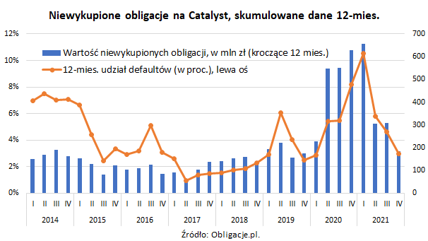 W 2021 r. na Catalyst nie spłacono 182,7 mln zł obligacji korporacyjnych, co stanowiło 3 proc. wygasającego wówczas złotowego zadłużenia wobec 8,2 proc. przed rokiem i 2,5 proc. przed dwoma laty. I z pewnością żadnej z sześciu niespłaconych w minionym roku serii nie można uznać za zaskoczenie. Chodzi bowiem o problemy trzech spółek, które wyszły na jaw jeszcze w latach 2018-2019 i w żadnym przypadku nie były one dziełem przypadku. Krótka lista niespłaconych w ubiegłym roku papierów ogranicza się więc do Zakładów Mięsnych Henryk Kania i dwóch windykatorów, Fast Finance oraz – a jakże – GetBacku. Dyskutować można by natomiast nad papierami Kancelarii Medius, ale akurat w przypadku giełdowej serii, która miała wygasać w ubiegłym roku (KME0321) spółce udało się w porozumieniu z obligatariuszami przesunąć termin spłaty długu i go systematycznie amortyzować, mimo trwającego postępowania restrukturyzacyjnego.