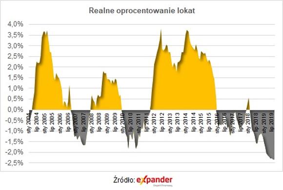 Po uwzględnieniu podatku od zysków oprocentowanie 1,32 proc. daje odsetki wynoszące zaledwie 1,07 proc.. W okresie trwania takiej lokaty ceny mogą jednak wzrosnąć aż o 3,5 proc.. Gdyby tak się stało, to przeciętna lokata przyniesie aż 2,35 proc. straty w ujęciu realnym. To byłby najgorszy wynik od 2004 r., czyli odkąd dostępne są dane o oprocentowaniu nowo zakładanych lokat.