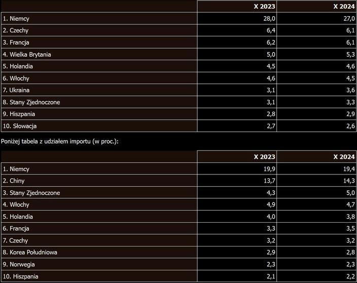 Poniżej tabele z udziałem eksportu i importu (w proc.):
