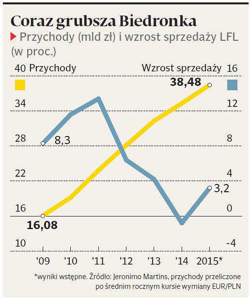 Jeronimo Martins, właściciel sieci, ogłosił, że osiągnęła ona 3,8-procentowy wzrost kluczowego wskaźnika dla branży, czyli sprzedaży LFL (na tej samej powierzchni co rok wcześniej). Oznacza to, że klienci starych sklepów wydawali w nich więcej, mimo minimalnego wzrostu cen żywności w ostatnich miesiącach roku.