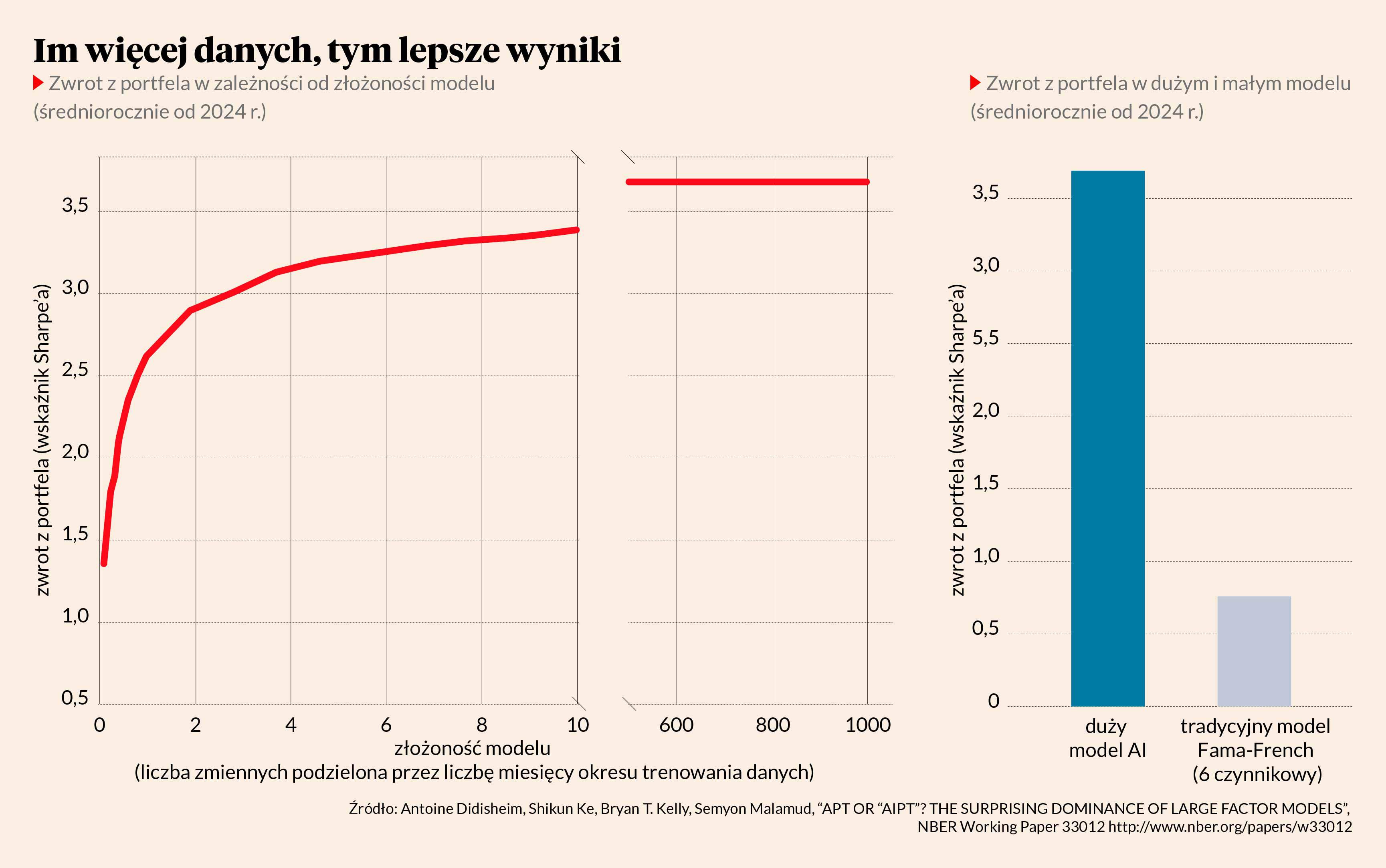 W tym badaniu jest zawarta jeszcze jedna konkluzja, która dla profesjonalnych zarządzających może być nawet ważniejsza niż spektakularne wyniki inwestycyjne. W świecie finansów i ekonomii panuje przekonanie, że złożone modele oparte na wielkich zbiorach danych sprawdzają się świetnie w wyjaśnianiu przeszłych zjawisk, ale słabo w przewidywaniu przyszłości. Badając miliony punktów danych, zawsze znajdzie się coś, co dobrze wyjaśnia historyczne wydarzenia, ale to nie musi oznaczać, że ten sam punkt sprawdzi się w przyszłości. W modelach, które pokazują doskonałe wyniki, zawarta jest często przypadkowość. Autorzy badania pokazują jednak, że stopniowe zwiększanie złożoności modelu daje systematycznie lepsze rezultaty prognostyczne. Na wielu danych widzą tę prawidłowość: im większa złożoność modelu, tym lepsze prognozy. To jest nowy i najważniejszy rezultat.