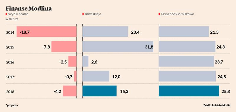 W tym roku zarząd Modlina planuje obsłużenie niemal 3 mln pasażerów i spodziewa się 4,2 mln zł straty brutto. Wzrost liczby pasażerów o 3,7 proc. oznacza, że drugi rok z rzędu lotnisko będzie rozwijać się wolniej niż w latach 2014-16, gdy ten poziom urósł z 1,7 mln do 2,8 mln osób. Gros z nich przewiezie Ryanair, który jest jedynym przewoźnikiem latającym z Modlina. Port liczy jednak na podpisanie umowy z bułgarską linią czarterową Voyage Air (od czerwca do 21 września chce latać do Warny dwa razy w tygodniu) i innymi. Przewiduje, że w tym roku nowi przewoźnicy będą mieli niemal 28 tys. pasażerów.