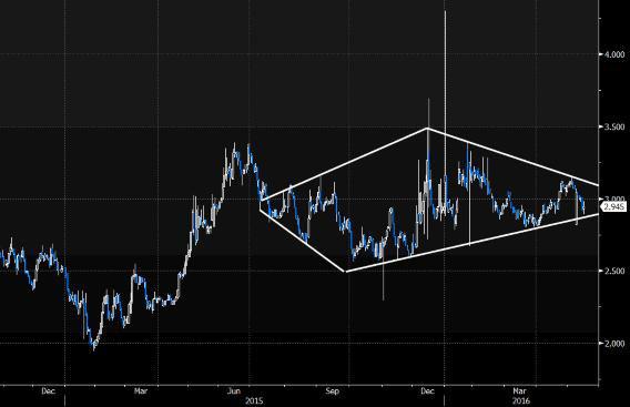 Paradoksalnie analiza techniczna zapowiada narodziny silnego trendu. Od połowy 2015 r. obawy inwestorów przed polityką nowego – jak wówczas oczekiwano – rządu stopniowo rosły, zwiększając zmienność na rynku obligacji 10-letnich, aż ta kulminowała na przełomie roku w okresie najgorętszych sporów o trybunał konstytucyjny oraz obniżenia polskiego ratingu przez agencję S&P. Teraz jednak wahania rentowności stopniowo spadają, a ich forma przybrała kształt rzadkiej formacji diamentu.