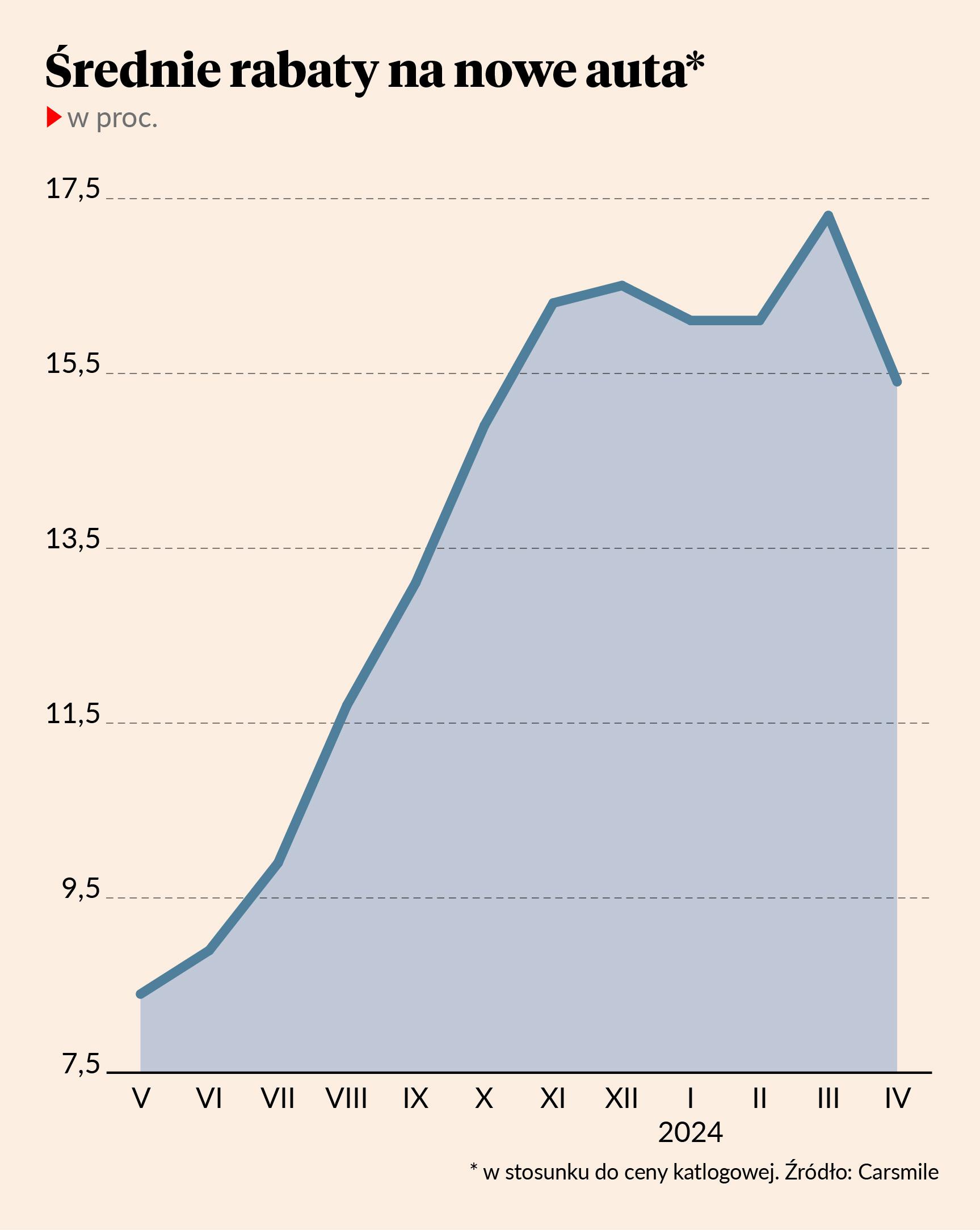 należy przyglądać się zmianom, jakie zachodzą w polityce rabatowej importerów oraz dilerów. Kwiecień przyniósł zauważalne zmniejszenie przeciętnego upustu, który jeszcze w marcu sięgał 17,3 proc. Trzeba jednak przyznać, że w skali roku wzrost jest bardzo duży — z 8,4 proc. w kwietniu 2023 r. do 15,4 proc obecnie.