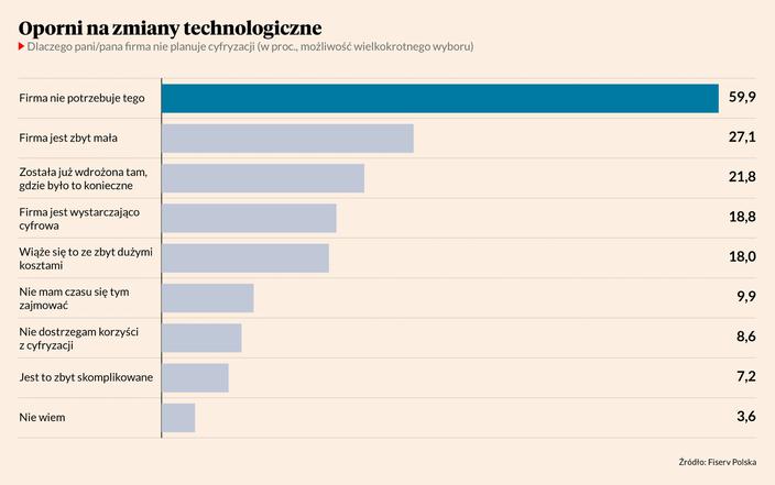 Aż 60 proc. firm uważa, że nie potrzebuje takich inwestycji, a co czwarta twierdzi, że jej skala działalności jest zbyt mała, by ponosić nakłady finansowe na przeprowadzenie cyfryzacji.