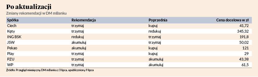 Po zwyżkach w czerwcu zmalała atrakcyjność akcji banków, uważają analitycy, którzy sugerują selektywne i bardziej neutralne podejście inwestycyjne. Zdaniem ekspertów lepiej od rynku powinna się natomiast zachowywać branża chemiczna z powodu spodziewanej poprawy wyników w kolejnych kwartałach. Najciekawiej wyglądają akcje Grupy Azoty, a rozczarowujące są wieści płynące z Ciechu, uważają specjaliści. Wśród spółek przemysłowych faworytami są Cognor, Famur, Pozbud, Kernel i Tim, analitycy sceptycznie oceniają natomiast Alumetal i Impexmetal oraz ostrzegają, że słabsze wyniki Boryszewa w drugim kwartale mogą prowadzić do naruszenia kowenantów w umowach z bankami.