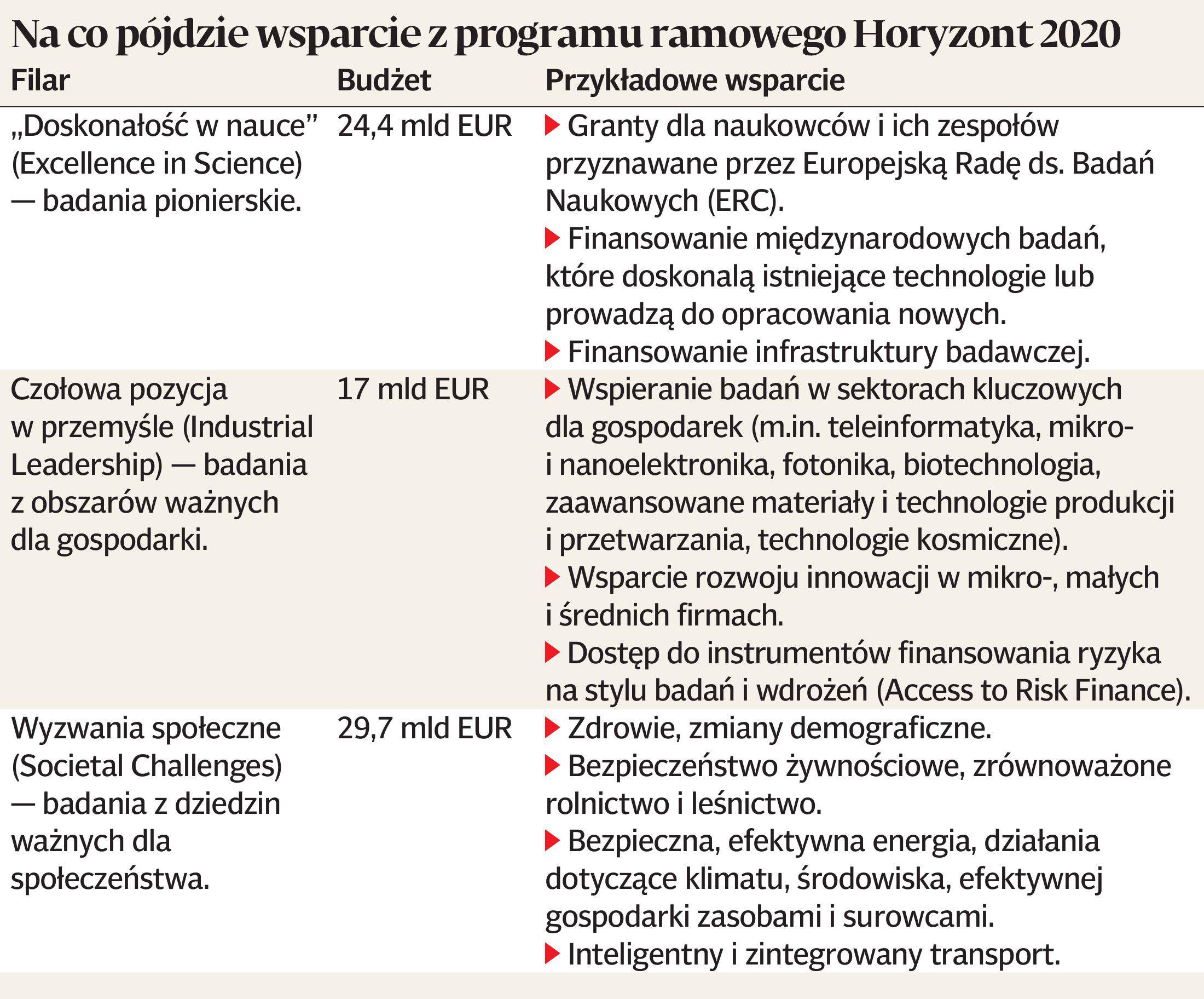 Nowy program składa się z trzech filarów. Ten, z którego będą mogli korzystać przedsiębiorcy, ma w puli 17 mld EUR. Unijne pieniądze pójdą m.in. na badania w sektorach ważnych dla gospodarki. Chodzi o takie branże, jak biotechnologia, technologia informacyjno-komunikacyjna, mikro- i nanoelektronika oraz fotonika. Bruksela nie będzie szczędziła euro na zaawansowane technologie produkcji i przetwarzania. Liczy też na nowe rozwiązania w technologiach kosmicznych. Poza wsparciem dla przemysłu i przedsiębiorców w programie są jeszcze dwa filary — z funduszami na badania naukowe (ponad 24 mld EUR) i na rzecz wyzwań społecznych (prawie 30 mld EUR).