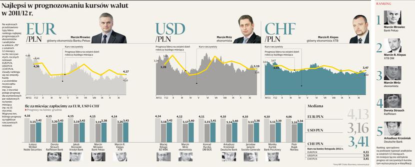 Wszystko to ma wpłynąć na symboliczne umocnienie naszej waluty — Monika Kurtek, podobnie jak Arkadiusz Krześniak z DB i Jarosław Janecki z Societe Generale prognozują, że pod koniec grudnia kurs EUR/PLN wyniesie 4,10 zł. Większym optymistą jest tylko Piotr Bujak, ekonomista Nordea Banku (prognozuje spadek kursu euro do 4,06 zł), który uważa, że decyzja RPP o obniżce stóp procentowych tylko o 25 pkt baz. na ostatnim posiedzeniu zmniejszyła obawy o gwałtowne łagodzenie polityki pieniężnej w Polsce. O żadnym łagodzeniu polityki pieniężnej nie ma mowy w Szwajcarii. Frank osłabił się jednak w ostatnich dniach do euro, po raz drugi „odklejając” się od bariery 1,20, tak pilnie strzeżonej przez Narodowy Bank Szwajcarii (SNB). Na większy ruch kursu w górę (co ucieszyłoby zadłużonych w tamtejszej walucie) nie ma jednak co liczyć — mówią ekonomiści.