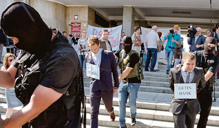 Finanse osobisteW czwartek 18 września punktualnie o godz. 12 przy warszawskim placu Powstańców trzej mężczyźni przebrani za policjantów zakuli w kajdanki trzech innych mężczyzn, przebranych za pracowników Komisji Nadzoru Finansowego (KNF), Getin Banku i TU Europa. Wszystko po to, by w ramach pikiety przed biurami KNF zrobić szum wokół tysięcy osób, które zainwestowały w polisy inwestycyjne, oferowane przez banki i ubezpieczycieli, a teraz nie są w stanie odzyskać wpłaconych pieniędzy.