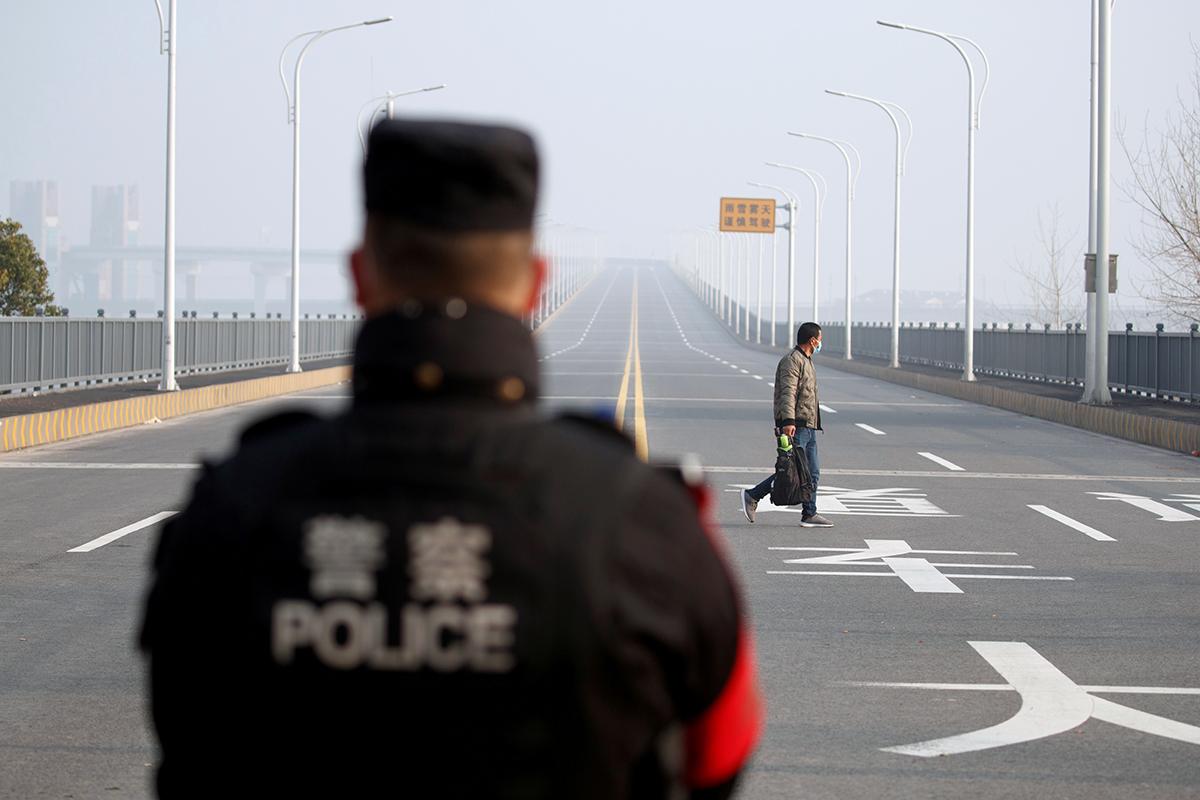 7. Mężczyzna z prowincji Hubei zbliża się do punktu kontrolnego na moście nad Jangdy w mieście Jiujiang. Konrole wprowadzono w związku z epidemią wywołaną przez nową odmianę koronawirusa. Fot. Thomas Peter / Reuters / Forum