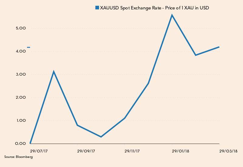 Cena złota w kontraktach spot rośnie o 1,7 proc. w kończącym się kwartale. Podobny wzrost zanotowało w poprzednim. Złoto drożeje pomimo rosnących stóp procentowych w USA. To głównie zasługa poszukiwania przez inwestorów tzw. bezpiecznej przystani w reakcji na wydarzenia geopolityczne, np. wzrost napięcia w relacjach USA z Koreą Północną. Obawy wojny handlowej po działaniach protekcjonistycznych w USA spowodowały wzrost zmienności na rynkach akcji. W ostatnim czasie inwestorów zaniepokoiło mianowanie przez prezydenta Donalda Trumpa Johna Boltona na stanowisko doradcy ds. bezpieczeństwa narodowego. Uznano iż może to zapowiadać wzrost napięcia między USA a Iranem.