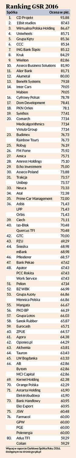 Po raz drugi srebrny medal zdobyła firma z tej samej branży. Tyle że poprzednio doszło do tego kilkanaście lat temu, a parę walczącą o laur zwycięzcy stanowiły banki, a więc sektor szeroko reprezentowany na giełdzie. W rankingu GSR 2016 pierwsze i drugie miejsce zajęli producenci gier komputerowych, a więc przedstawiciele sektora rozbudzającego emocje nawet w domowym zaciszu, ale na giełdzie zdecydowanie mniej licznego.