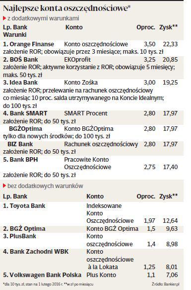 Wyższe stawki obowiązują przez określony, krótki czas i tylko wtedy, gdy klient spełni dodatkowe warunki. Najczęściej to: założenie konta osobistego, wpłacenie pieniędzy, przelewanie do banku wynagrodzenia. Banki stosują także ograniczenia kwotowe — wyższe oprocentowanie obowiązuje tylko dla określonej sumy. Najwyższą stawkę na tego rodzaju rachunku oszczędnościowym (dla 10 tys. zł) proponuje obecnie Orange Finanse, który przedłużył obowiązującą w styczniu promocję do 17 marca. Konta oszczędnościowe niepowiązane z rachunkiem osobistym nie są atrakcyjnie oprocentowane. Średnie oprocentowanie pięciu najlepszych — bez dodatkowych warunków i ograniczeń — wynosi zaledwie 1,44 proc. Najwyższa stawka — 1,97 proc. — to propozycja Toyota Banku.