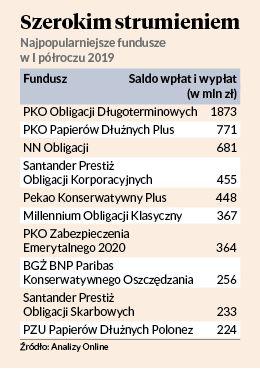 Zysk za 12 miesięcy (1,9 proc.) i za 3 lata (6 proc.) plasuje go na 13-14 miejscu wśród 16-17 porównywalnych rozwiązań. Według danych Analiz Online na podium rankingu popularności zmieścił się jeszcze NN Obligacji (+681 mln zł). W czołowej dziesiątce są niemal wyłącznie rozwiązania dłużne — rodzynkiem jest PKO Zabezpieczenia Emerytalnego 2020, który należy do grupy funduszy mieszanych zagranicznych.