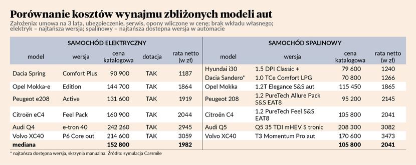 Mediana ceny katalogowej auta elektrycznego wyniosła 152,8 tys. zł, co oznacza, że są to w większości pojazdy relatywnie tanie. Uśredniony abonament wyniósł natomiast 1982 zł wobec 2041 zł za auto z silnikiem spalinowym.