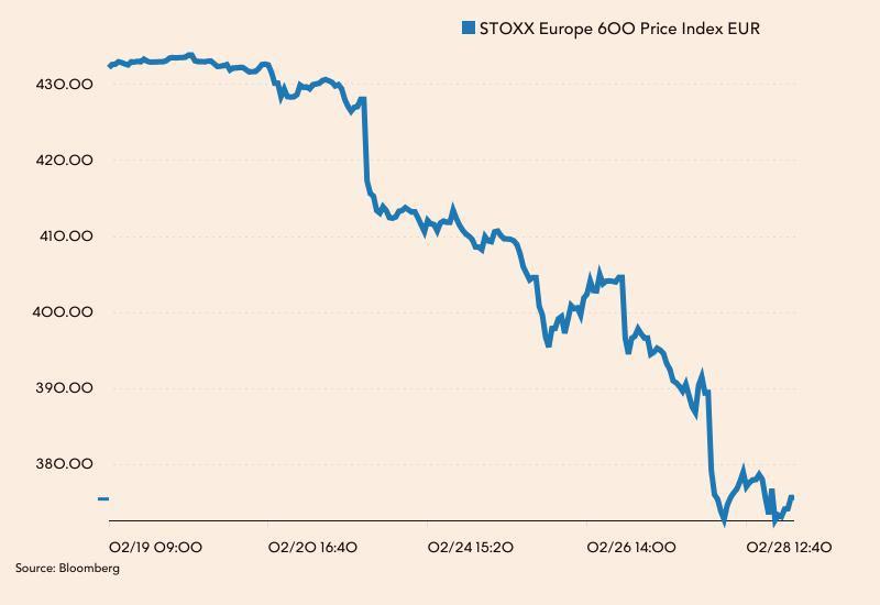 „Rynki niedźwiedzia”, definiowane jako spadek o ponad 20 proc. od ostatniego szczytu, są prawdopodobne na giełdach w Mediolanie, Londynie i Madrycie. DAX, główny indeks giełdy we Frankfurcie spadał nawet o 8,2 proc. Jego wartość spadała w tym momencie od rekordowego zamknięcia z 19 lutego o 23 proc.