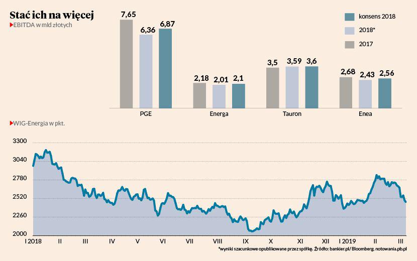 Indeksowi ciążyli przede wszystkim państwowi giganci, czyli PGE, Energa, Tauron i Enea, którzy w tym czasie podawali szacunkowe wyniki za rok 2018. Chociaż w skład WIG-Energia wchodzi 11 spółek, to właśnie te cztery największe kontrolowane przez skarb państwa odpowiadają za 90 proc. portfela i jeszcze większy odsetek całkowitych obrotów. Z tej grupy tylko Tauron zdołał sprostać oczekiwaniom rynku i poprawić wyniki rok do roku, ale nie pozwoliło mu to na uniknięcie spadku.