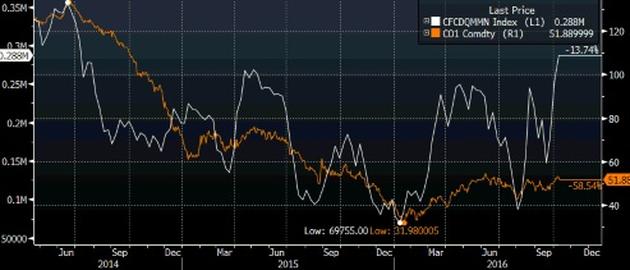 Pozycja netto profesjonalnych zarządzających na rynku ropy na tle (w ilości kontraktów, linia biała, skala lewa), na tle notowań surowca (w USD za baryłkę, linia pomarańczowa, skala prawa). Źródło: CFTC, Bloomberg.