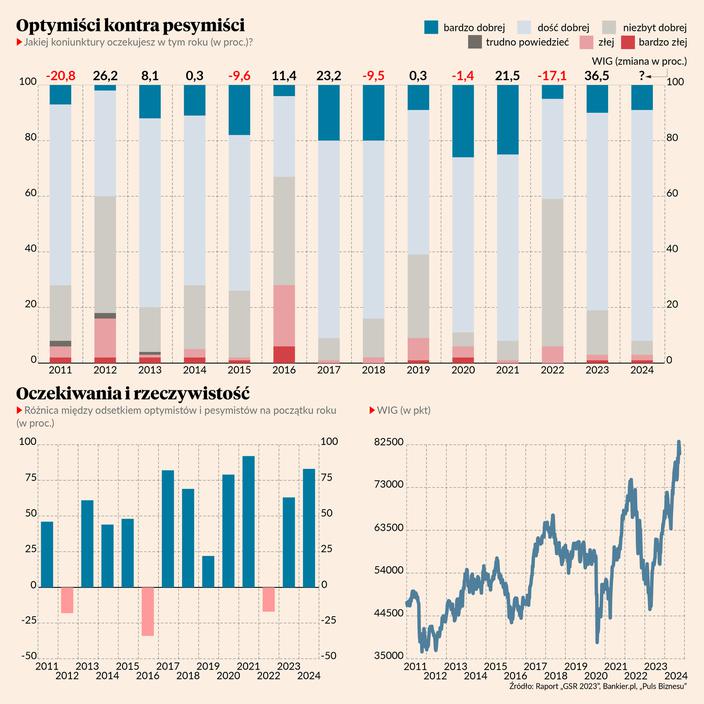 Problem w tym, że rynek finansowy to wredna i złośliwa bestia. Kpi sobie z oczekiwań inwestorów i ośmiesza predykcje nawet najlepszych analityków. Dlatego też wielu doświadczonych uczestników tej zabawy z niepokojem przyjmuje informacje o szampańskich nastrojach na giełdowym parkiecie. Tym bardziej, że tegoroczny sentyment w badaniu GSR jest jednym z najmocniejszych w historii. Równie optymistyczne nastroje panowały tylko w roku 2021 i 2017.
