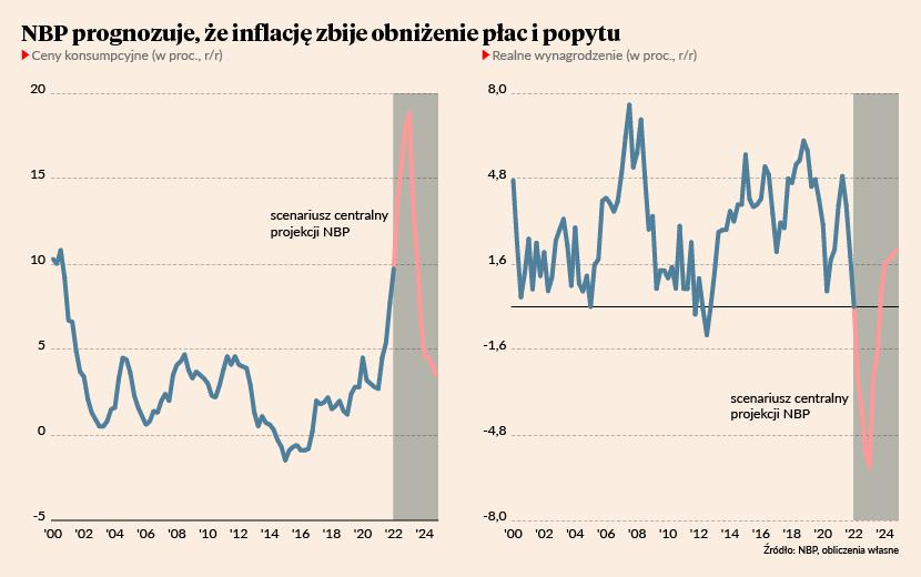Najciekawsze w projekcji jest to, że po szybkim wystrzale inflacja ma później równie szybko się obniżać. Na początku 2024 r. wyniesie w tzw. bazowym scenariuszu niecałe 5 proc. (rozpiętość projekcji od -2 do 11 proc.). Dlaczego? Ano dlatego, że inflacja sama się zmasakruje — obniży realne wynagrodzenia ludności i popyt krajowy na tyle, że w końcu firmy przestaną mieć zdolność podnoszenia cen. Nie dojdzie zatem do zakorzenienia inflacji, spirali inflacyjnej, która mogłaby na dłużej zagościć w gospodarce nawet w warunkach recesji.