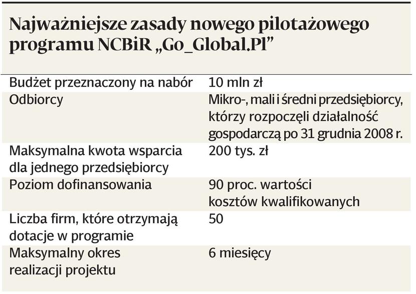 Jak uzyskać dostęp do światowych rynków? Na pewno pomogą w tym dotacje i znalezienie zagranicznych inwestorów, którzy pomagają innowacyjnym firmom wpłynąć na szerokie wody. Tego typu wsparcie umożliwia w swoim najnowszym pilotażowym programie Narodowe Centrum Badań i Rozwoju (NCBiR). W przedsięwzięciu pod nazwą Go_Global. Pl innowacyjne mikro-, małe i średnie firmy zyskają zagranicznych partnerów i dofinansowanie na rozwój. Do wzięcia jest łącznie 10 mln zł, a każdy przedsiębiorca może dostać 200 tys. zł. Warunek — wsparcie jest kierowane do firm, które powstały nie wcześniej niż w 2009 r.