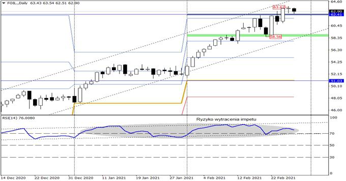 Technicznie patrząc ropa naftowa wyszła górą w ostatnich dniach z konsolidacji 62,41 – 58,50 USD. Teraz testujemy jej górne ograniczenie, ale w ramach impulsu spadkowego. Dopiero jego zatrzymanie we wnętrzu ww. konsolidacji może przywrócić nieco lepsze nastawienie, ale jednocześnie trzeba śledzić czy przekręca się dźwignia w stronę risk off. Pamiętajmy również, że ważne wsparcie – pivot mamy w okolicy 57,82 USD, gdzie przebiega także dolne ograniczenie kanału wzrostowego na FOIL.