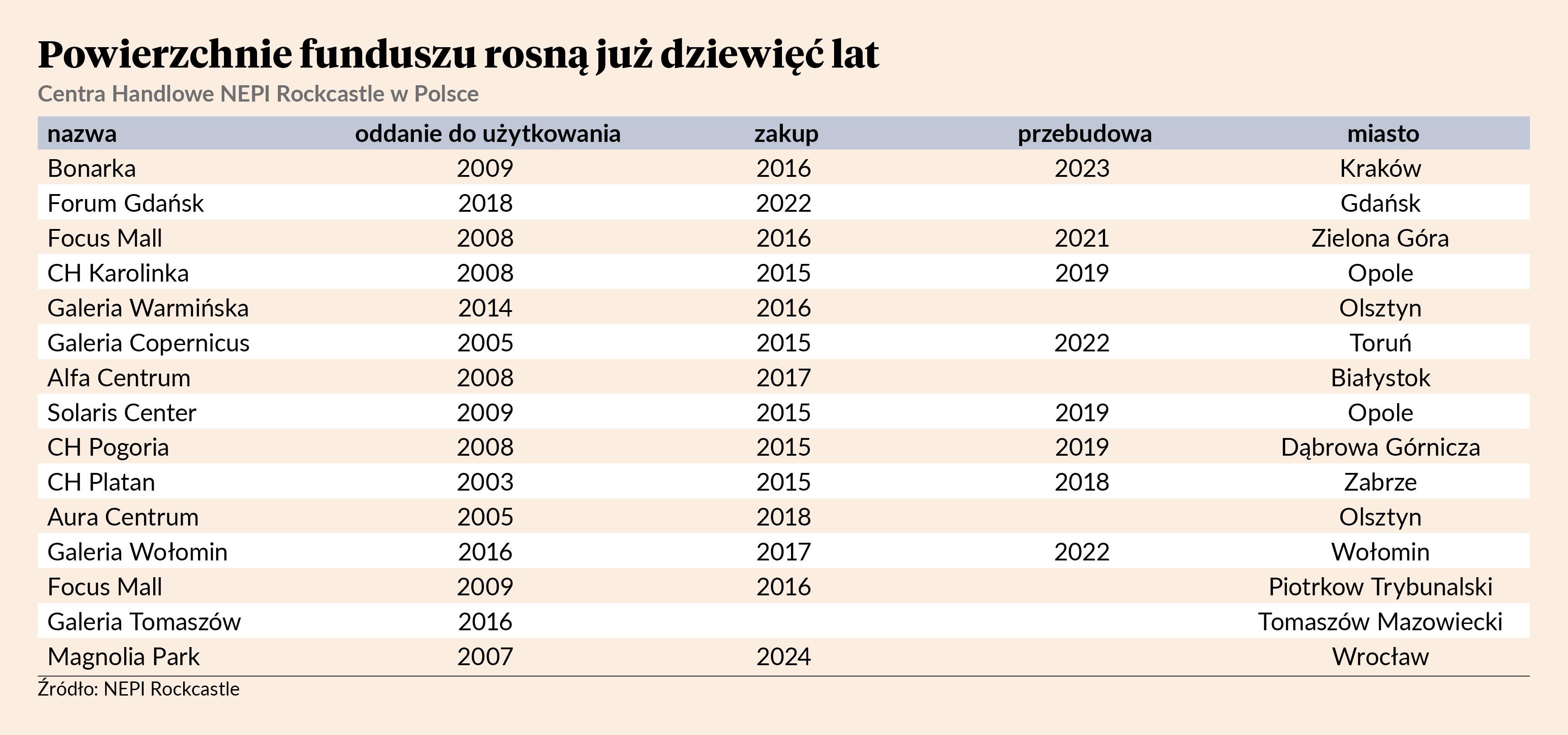 Grupa NEPI Rockcastle działa w ośmiu krajach Europy Środkowo-Wschodniej — Bułgarii, Chorwacji, Czechach, Litwie, Polsce, Rumunii, Słowacji i Węgrzech. Ma łącznie 56 nieruchomości handlowych, z czego 15 zlokalizowanych w Polsce odpowiada za około 30 proc. wycenianej na 7,5 mld EUR wartości całego portfela.