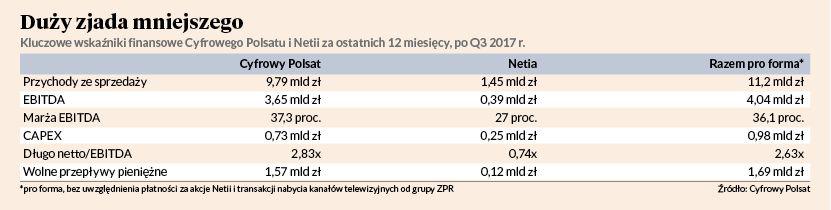 W poniedziałek, tuż przed startem wezwania, za jedną akcję Netii na GPW płacono 5,33 zł, czyli o prawie 8 proc. mniej, niż oferuje grupa Zygmunta Solorza-Żaka. Dla telekomu wchłonięcie przez Cyfrowy Polsat przychodzi w momencie, gdy regularnie traci klientów i przychody, choć nadal generuje sporo gotówki. Jakub Viscardi, analityk DM BOŚ, spodziewa się, że Netia w czwartym kwartale wypracuje około 358 mln zł przychodów, czyli o 4 proc. mniej niż rok wcześniej. Spadek ma być efektem głównie utraty klientów, obsługiwanych przy pomocy infrastruktury innych telekomów. Zysk EBITDA według analityka ma spaść jeszcze mocniej — ma on wynieść 96,2 mln zł, czyli o 16 proc. mniej rok do roku. Z punktu widzenia drobnych inwestorów ważniejsze będzie jednak to, czy Netia podzieli się ubiegłorocznym zyskiem. W poprzednich latach spółka była szczodra dla akcjonariuszy — czasem bardziej, niż planowała. W 2017 r. zarząd rekomendował wypłatę 0,2 zł na akcję, ale walne zgromadzenie postanowiło wypłacić 0,38 zł. Teraz DM BOŚ spodziewa się dywidendy w wysokości 0,25 zł, ale jest spore ryzyko, że nie będzie jej wcale, co wstępnie sygnalizowali już przedstawiciele Cyfrowego Polsatu. „Wciąż zakładamy wypłatę dywidendy na poziomie 0,25 zł na akcję, ale uważamy, że po przejęciu kontroli przez Cyfrowy Polsat polityka dywidendowa może ulec zmianie i brak wypłaty musi być rozważany jako możliwy scenariusz. Cyfrowy Polsat może wstrzymać wypłaty do czasu osiągnięcia progu 100 proc. w akcjonariacie, do czego naszym zdaniem może dojść w 2019 r. po ogłoszeniu drugiego wezwania” — napisał Jakub Viscardi w styczniowej rekomendacji dla Netii. W ubiegłym tygodniu Netia poinformowała, że „zaktualizowała założenia wyceny aktywów”, w związku z czym w jednostkowym sprawozdaniu finansowym za 2017 r. może rozpoznać odpisy w wysokości ponad 150 mln zł.