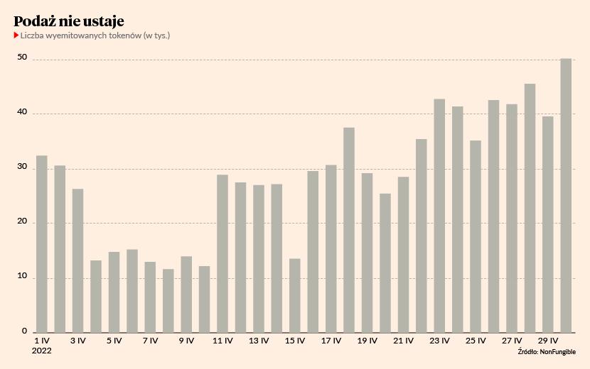 W tym sprzyjającym środowisku rozwinęły się “Moonbirds”. Stworzona przez grupę Proof Collective kolekcja 10 tys. komputerowo wygenerowanych sów utrzymywała przy życiu runek tokenów w ostatnich tygodniach. Ceny kolorowych ptaków na rynku wtórnym w ciągu dwóch tygodni od premiery wahały się między 60 tys. USD a 480 tys. USD (kurs emisyjny wynosił 7,5 tys. USD). Ich wolumen sprzedaży w kwietniu był osiem razy większy niż jakiejkolwiek innej kolekcji. Co ciekawe, ruch na tokenach z innych kolekcji studia Proof Collective był bliski zera.