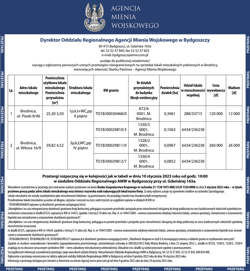 NIERUCHOMOŚĆ NA SPRZEDAŻ BRODNICA. AGENCJA MIENIA WOJSKOWEGO Komunikat partneraopublikowano: 2022-12-08 13:54PosłuchajZostań subskrybentemi słuchaj tego oraz wielu innych artykułów w pb.pl