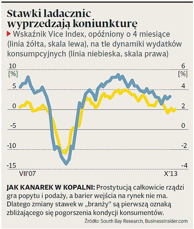 Wskaźnik obrazujący wydatki na prostytucję i hazard ostrzega przed pogorszeniem koniunktury znacznie wcześniej niż standardowe dane. — Wydatki na prostytucję i hazard to bardzo dobre dane do przewidywania przyszłej kondycji amerykańskiego konsumenta — twierdzi Andrew Zatlin z firmy doradczej South Bay Research.