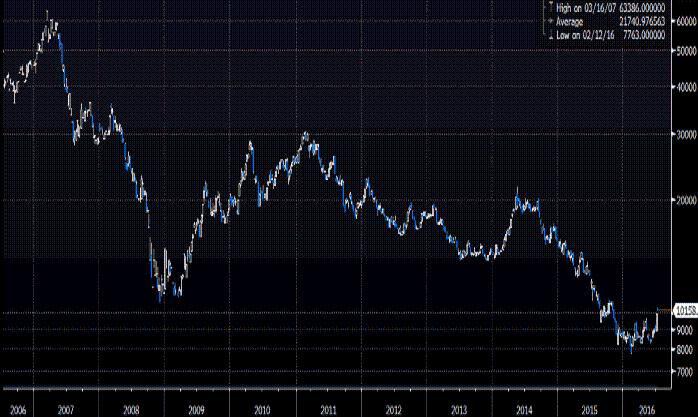 Notowania kontraktów na nikiel na giełdzie w Londynie w ostatnich 10 latach. Źródło: Bloomberg.